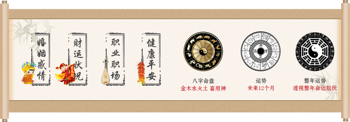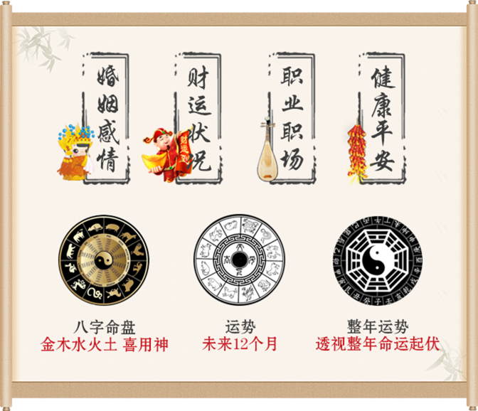 八字算命让你清晰知道自己命中注定的婚姻、财运、事业、健康等,让你在人生道路上能根据自己的命有所准备,做到“得时而进,失时而退”从而趋吉避凶把握好自己的未来,减轻不必要的损失,让自己的财富、婚姻、事业达到真正想要的。所谓知己知彼百战百胜,知命改命,方能长行。